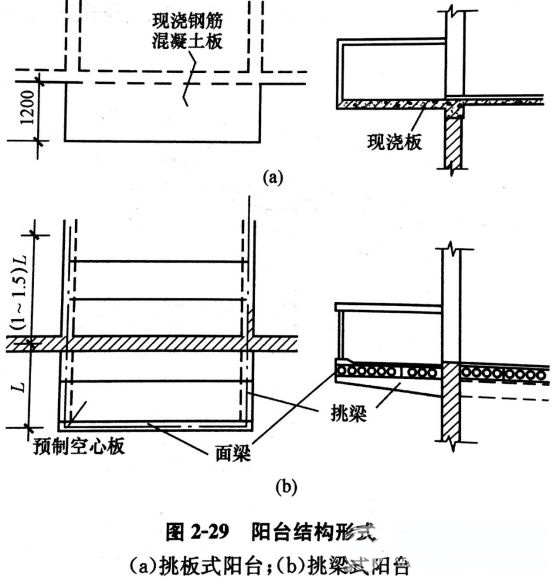 陽(yáng)臺(tái)形式很多,在使用方面,有生活陽(yáng)臺(tái)、******陽(yáng)臺(tái)。生活陽(yáng)臺(tái)供生活起居之用,******陽(yáng)臺(tái)為從事家務(wù)活動(dòng)等用。而陽(yáng)臺(tái)結(jié)構(gòu)形式有挑板式陽(yáng)臺(tái)和挑梁式陽(yáng)臺(tái)兩種,見(jiàn)下圖。